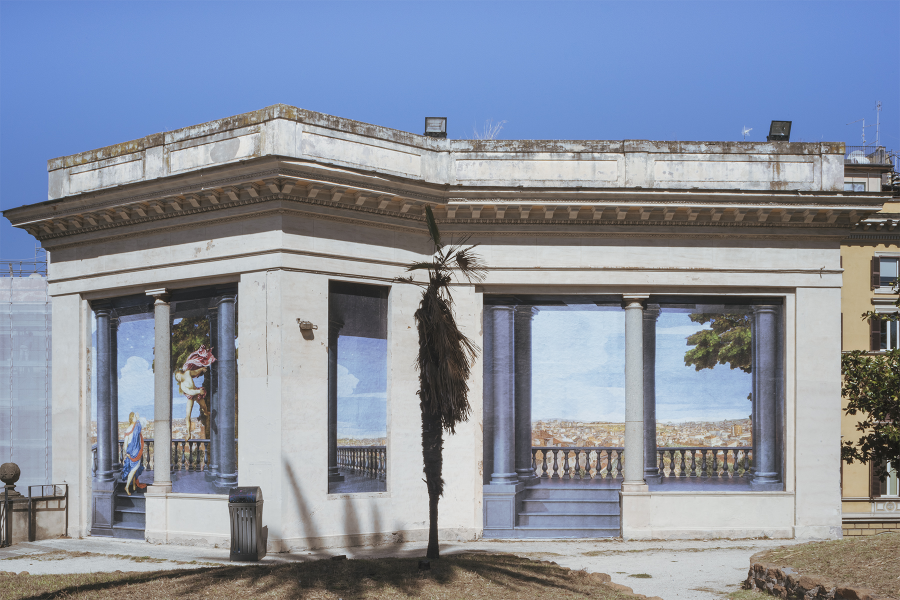 Promoted by: Roma Capitale, Assessorato alla Crescita culturale – Sovrintendenza Capitolina ai Beni CulturaliMedia partner: Dude MagThe site-specific installation ‘Loggia Aldobrandini ‘- that is totally eco-sustainable and reversible for the exclusive use of removable paper - is a kind of revisited ephemeral superstructure. It suggests perspective spaces inspired by the architectural views of the Renaissance and the Baroque Roman quadraturismo, but referring to modern architectural works, such as the blue building in Via Florence. The human presence is barely present in this imaginary view: the mythological figures are Bacchus and Arianna, from the homonymous painting by Tiziano.