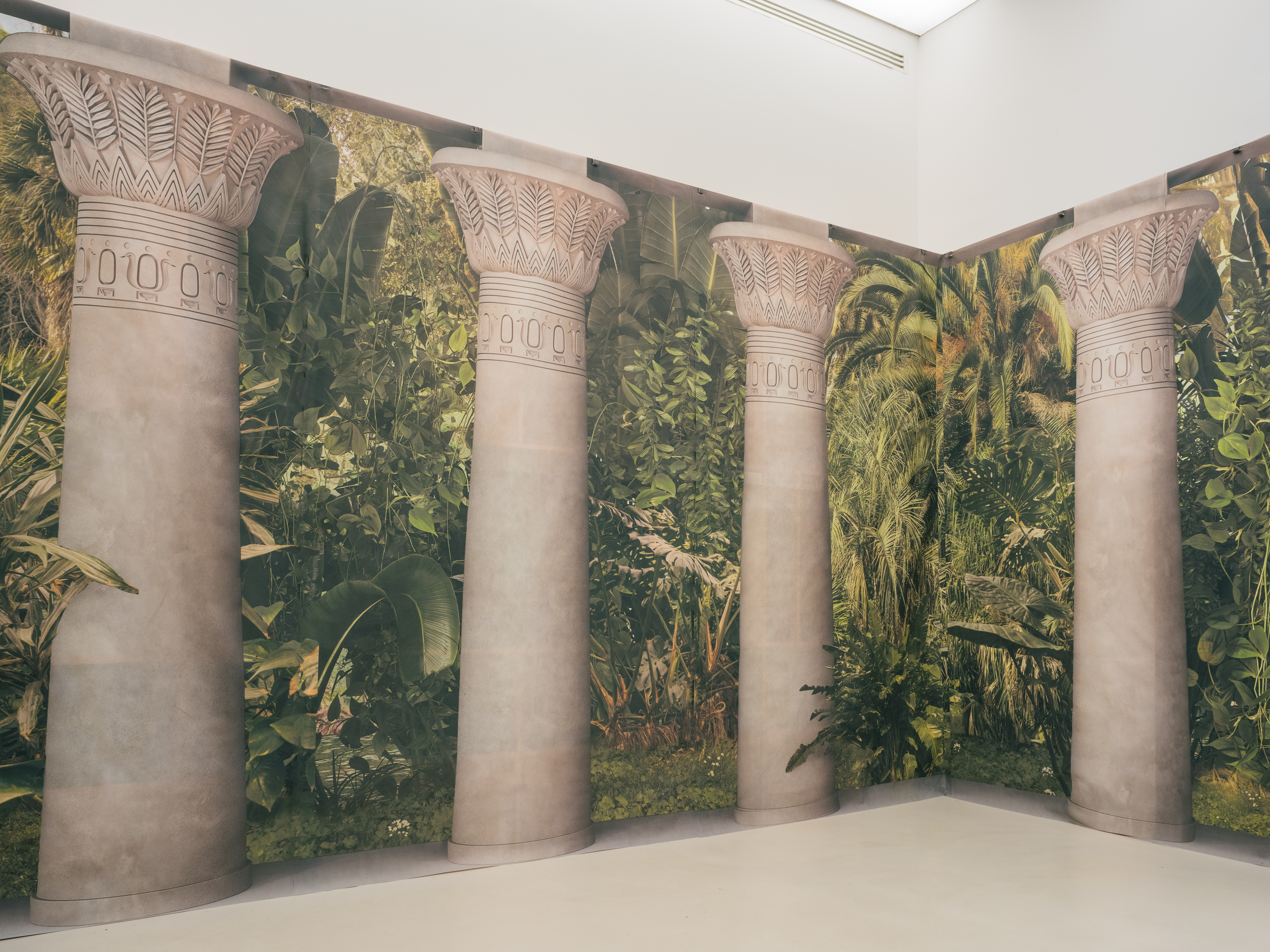 The students sampled multiple urban sounds and noises to create an immersive soundtrack, and made a fictional colonnade by sampling and 3d modeling the Tempio dei Propilei Egizi by Luigi Canina in Villa Borghese, a fascinating example of eclecticism used in the installation as an architectural transition element between the real space and the imaginary tropical garden depicted on the walls.